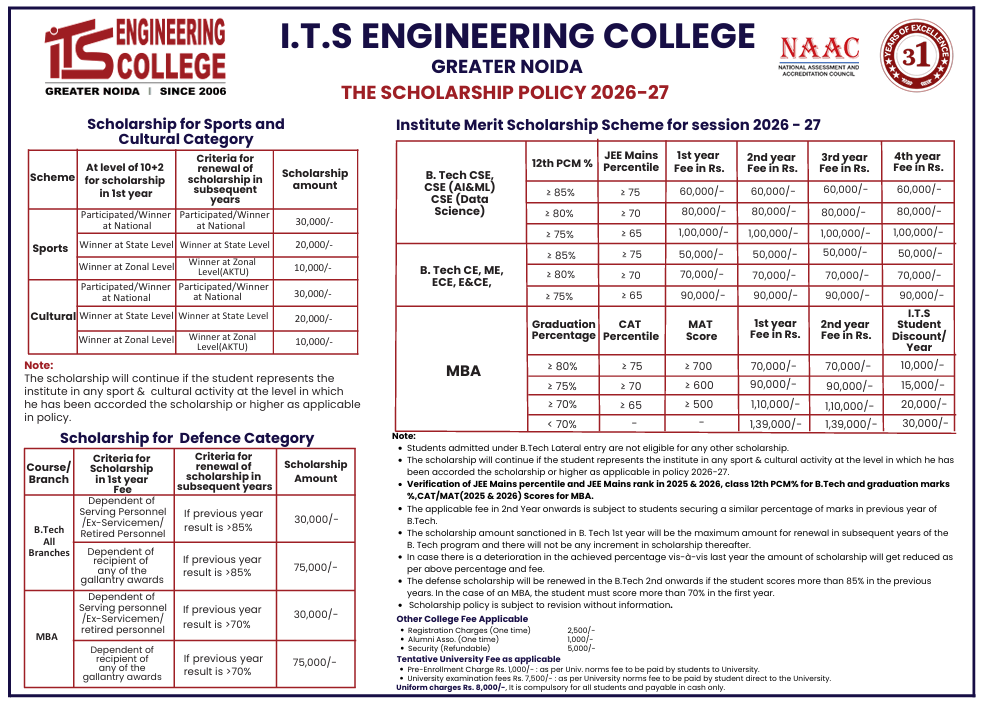 ITS scholarships are given on basis of Merit and other related achievements