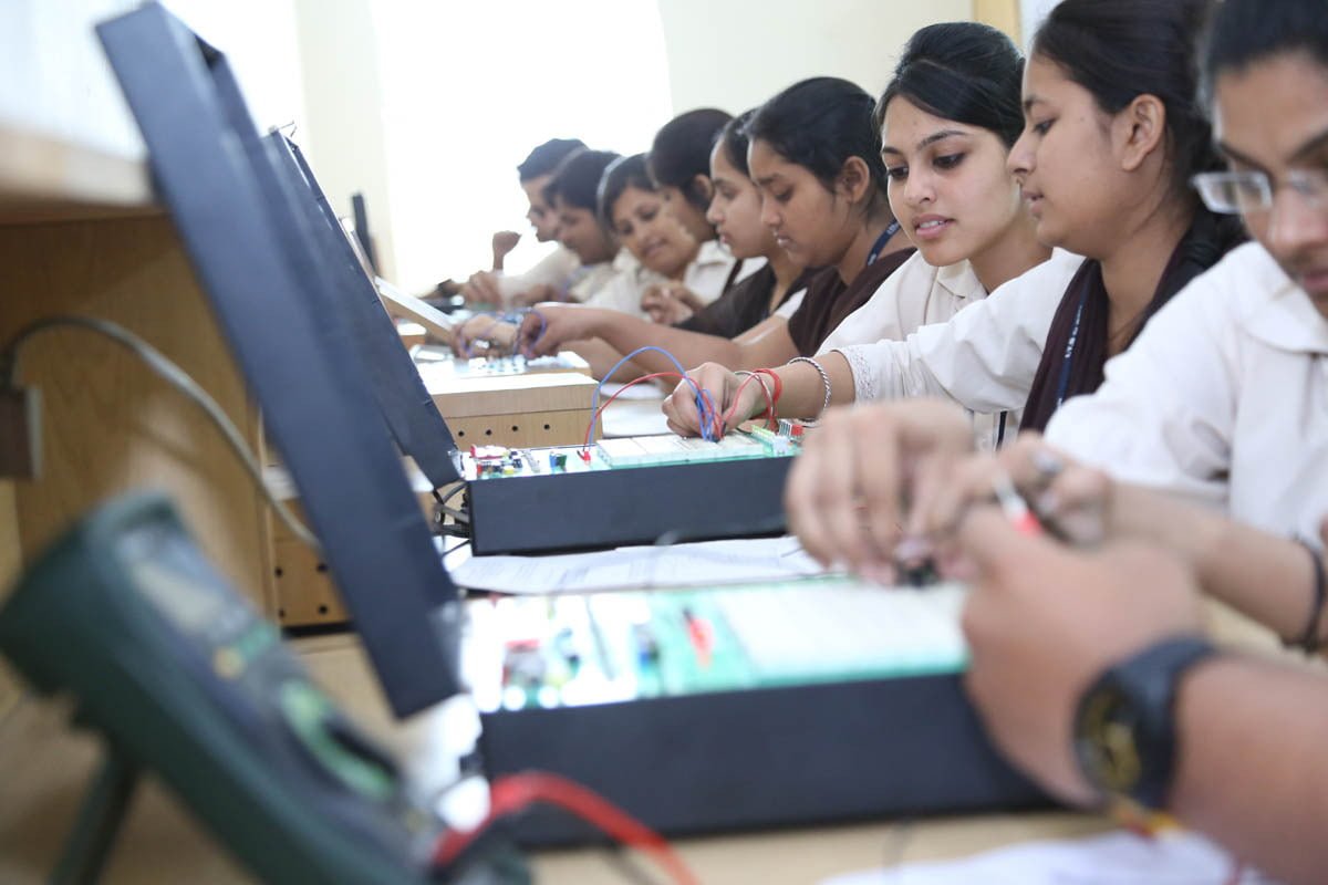 ECE students enhancing skills through hands-on circuit design and testing in modern labs.